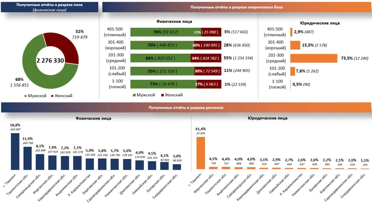 Жинсий таркиб бўйича эса кредит ҳисоботларидан фойдаланганларнинг 68 фоизи эркаклар, 32 фоизи аёллар ҳиссасига тўғри келади. Бу кредитлаш жараёнлари ва кредит тарихини назорат қилишда эркаклар фаоллиги юқорироқ эканини кўрсатади.