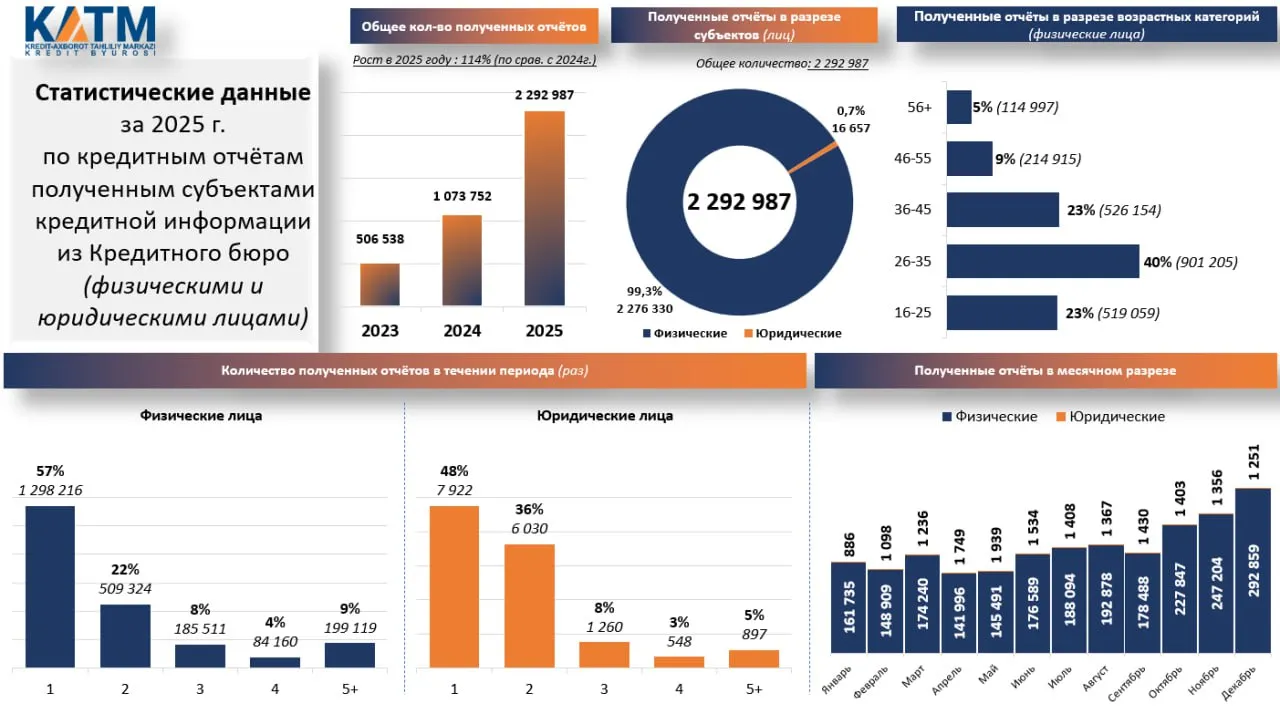 Бу кўрсаткич 2024 йилга нисбатан 114 фоизга кўп бўлиб, кредит тарихига бўлган қизиқиш кескин ошганини кўрсатади. Таққослаш учун, 2023 йилда атиги 506 мингта, 2024 йилда эса 1,07 миллионта кредит тарихи бўйича ҳисобот олинган эди.