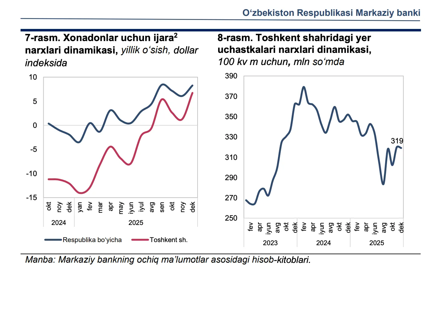 Уй-жой ижараси нархларининг доллардаги ўсиш суръати йил охирига келиб 8,3% га етган, бироқ Тошкент шаҳрида бу кўрсаткич мамлакат ўртача даражасидан бироз паст. Шу билан бирга, сўмда ижара нархлари деярли ўзгармаган, бу эса бозорда таклиф талабни етарли даражада қоплаётганини кўрсатади.