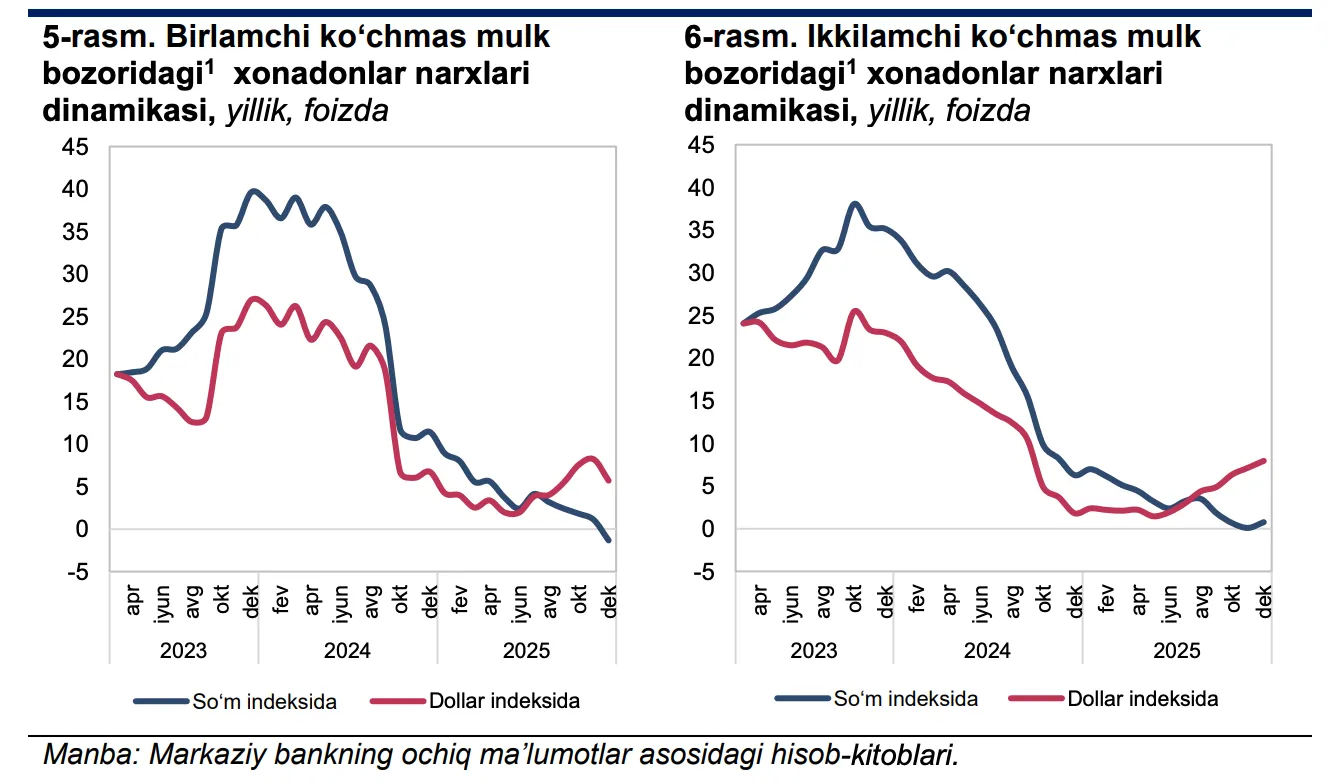 Бирламчи бозорда уй-жой нархлари охирги чоракда сўмда 1,3% га пасайган, аммо долларда 5,7% га ошган. Иккиламчи бозорда эса нархлар миллий валютада 0,7%, долларда 7,9% га кўтарилган.