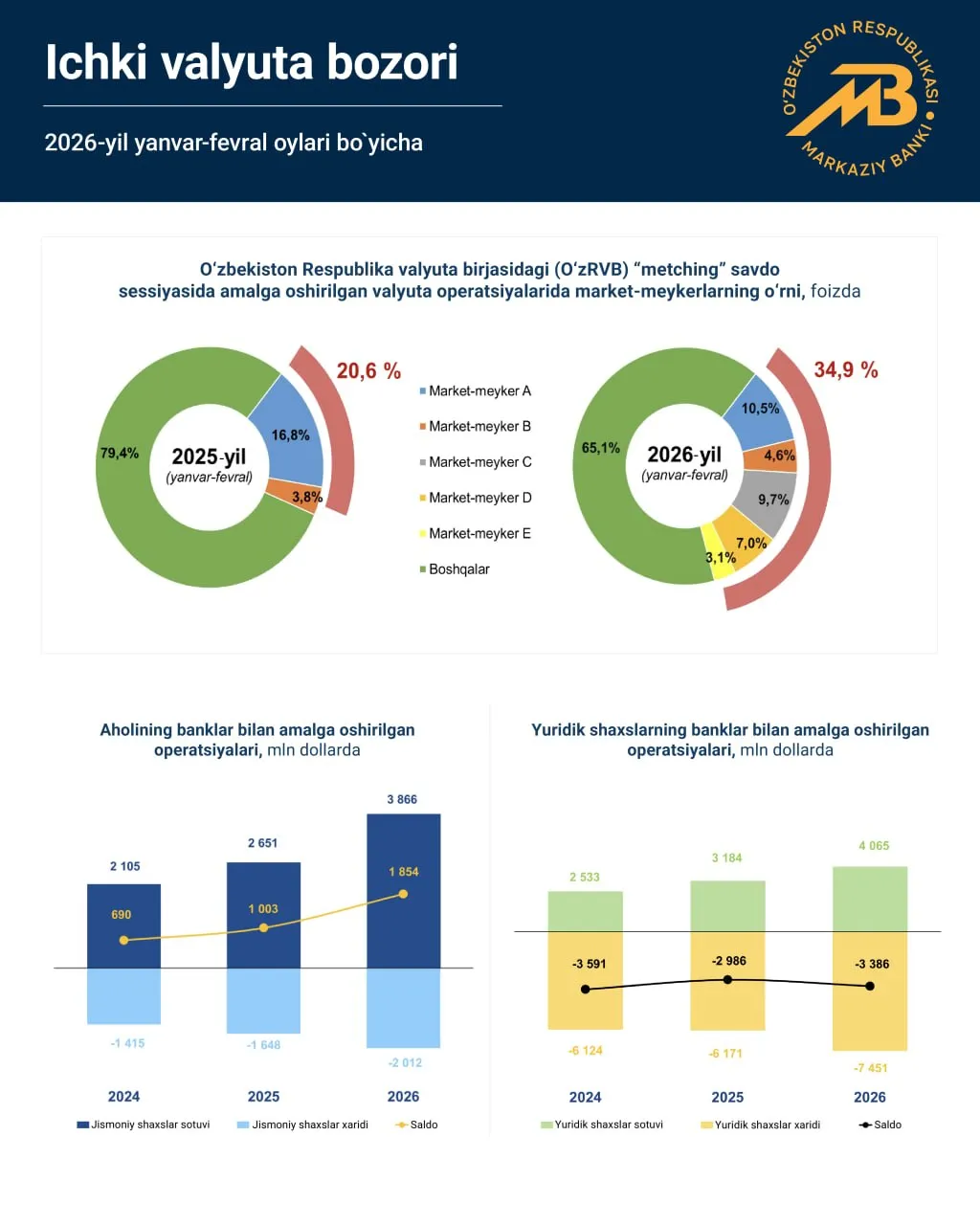 Юридик шахслар операцияларида эса аксинча манфий сальдо сақланиб қолмоқда. 2026 йилда компаниялар томонидан банклардан харид қилинган валюта ҳажми 7,45 млрд долларни ташкил этган бўлса, сотув 4,06 млрд доллар атрофида қайд этилган. Натижада юридик шахслар бўйича сальдо 3,38 млрд доллар минус кўрсаткичда қолган.