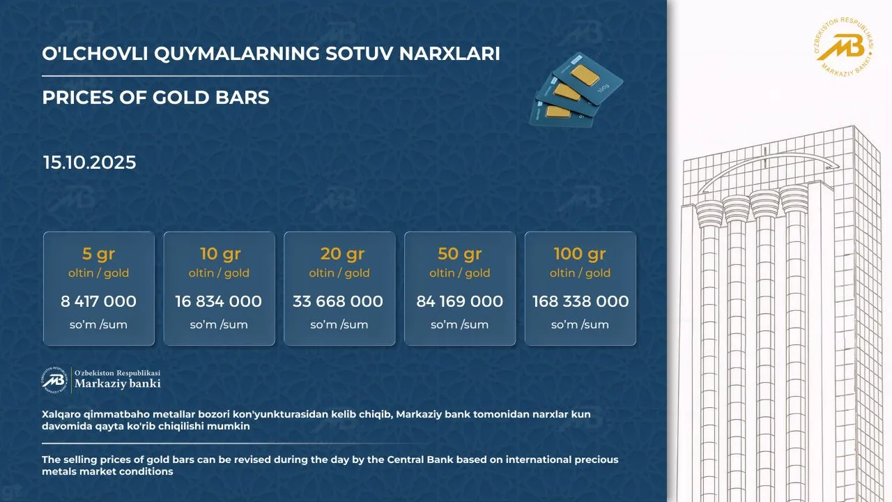 15 октябрдан олтин қуймасинг бир грамми 1 млн 683 минг сўмдан белгиланди. Жаҳон бозорида эса олтин нархи бир унция учун $4 200 га яқинлашди.