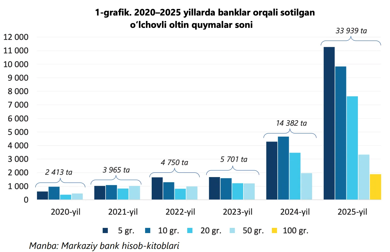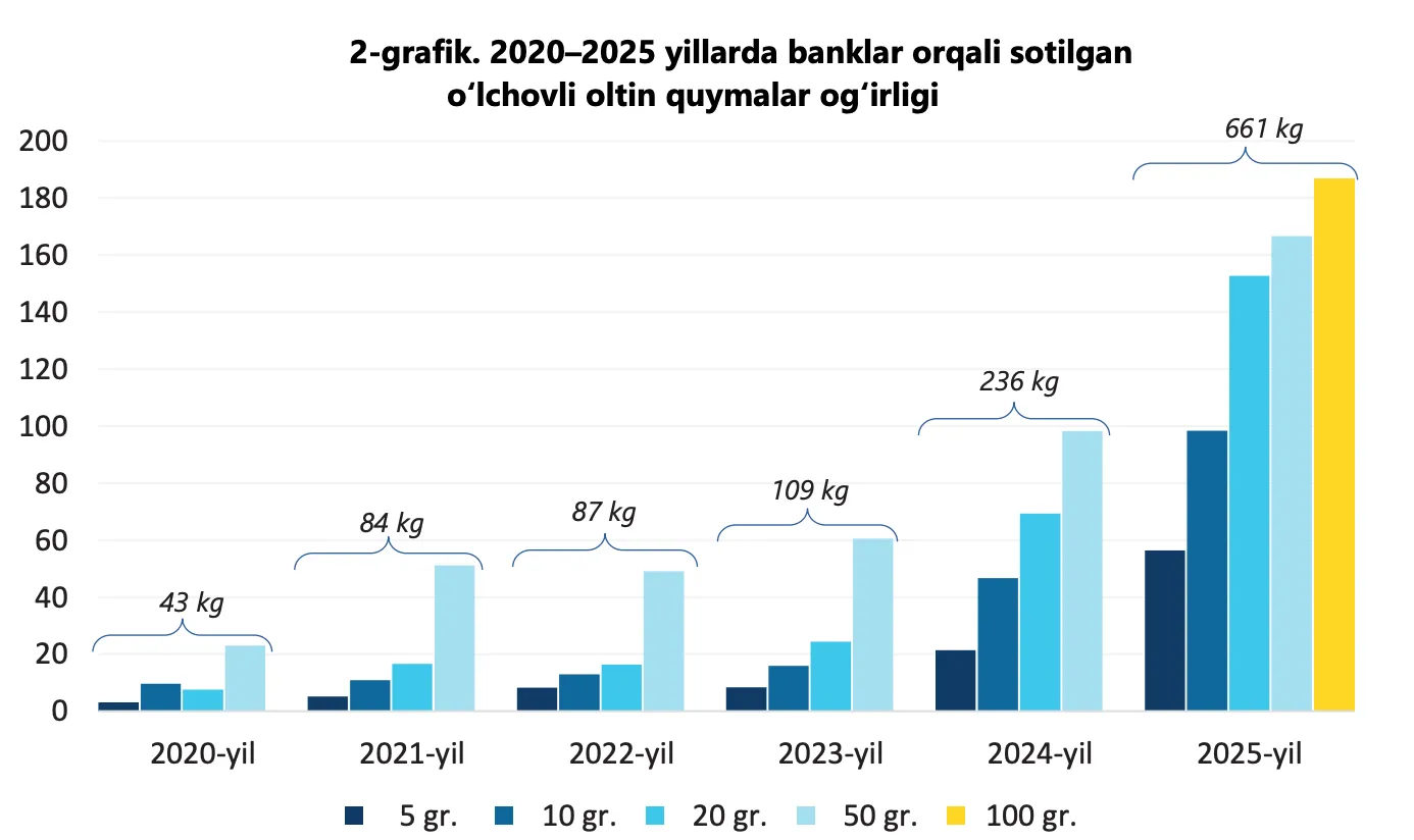 Йил давомида банклар орқали аҳолига умумий оғирлиги 661 килограмм бўлган 33 939 дона ўлчовли олтин қуйма сотилган. Бу кўрсаткич 2020–2024 йилларда сотилган жами олтин ҳажмидан (558 кг) 18,4 фоизга кўп бўлиб, сўнгги беш йиллик рекорд янгиланганини кўрсатади. Харидларнинг асосий қисми 5 ва 10 граммлик қуймалар ҳиссасига тўғри келмоқда