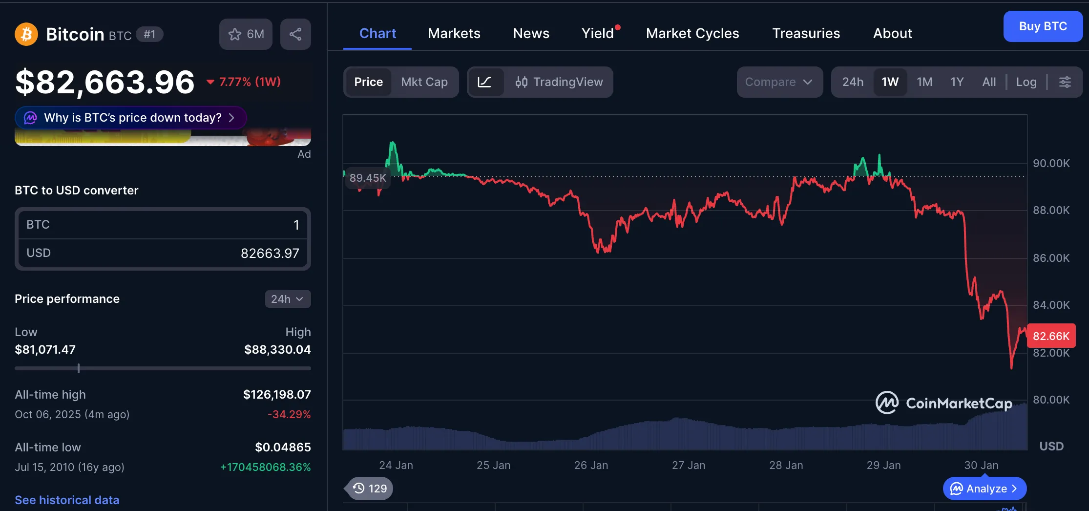 30 январь куни Bitcoin нархи 81,1 минг долларгача пасайди. Бу кўрсаткич 2025 йил 21 ноябрдан буён қайд этилган энг паст даража ҳисобланади.