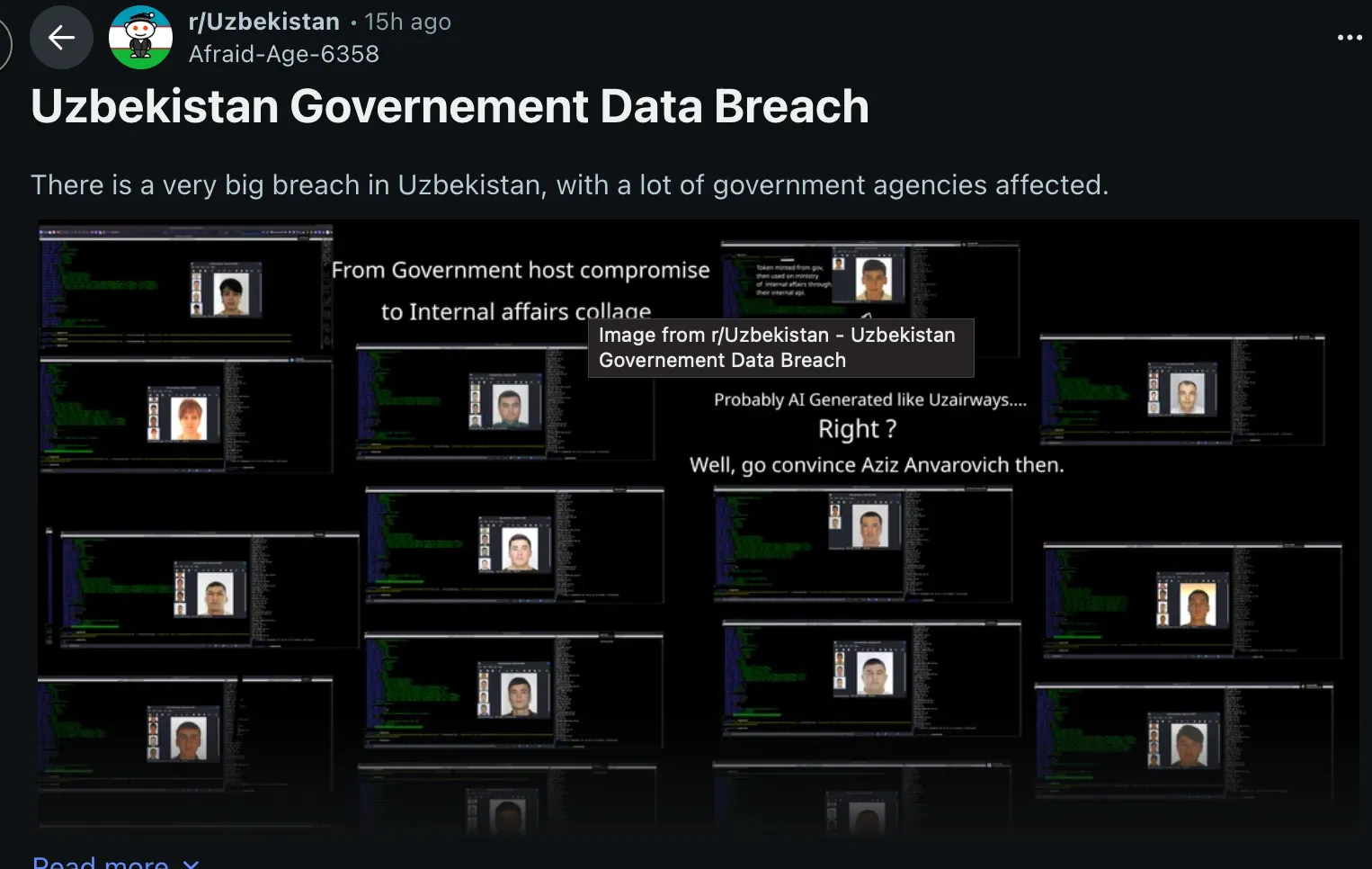 Reddit платформасида Ўзбекистон фуқароларига тегишли бўлиши мумкин бўлган қарийб 15 миллион шахсий маълумотлар даркнетда тарқалгани ҳақида хабарлар пайдо бўлди.