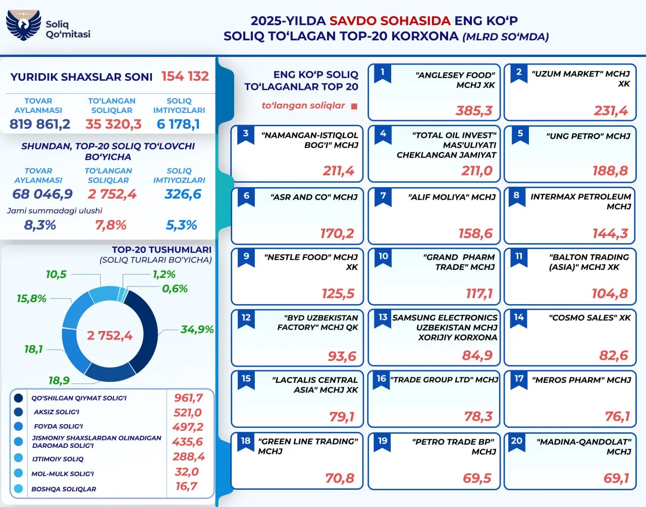 Қўмита маълумотларига кўра, йил давомида 154,1 мингта савдо корхонаси томонидан давлат бюджетига жами 35,3 трлн сўм солиқ тўловлари амалга оширилган. Ушбу сумманинг 7,8 фоизи ёки 2,75 трлн сўми энг йирик 20 та компания ҳиссасига тўғри келади.