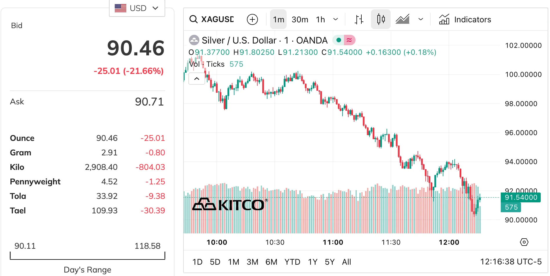 Савдолар давомида кумушнинг энг паст нархи 90,1 долларни ташкил этди. Бу аввалги рекорд даражадан қарийб 22 фоизга кам. Хабар тайёрланаётган пайтда кумуш бир унцияси 90,4 доллар атрофида савдо қилинмоқда.