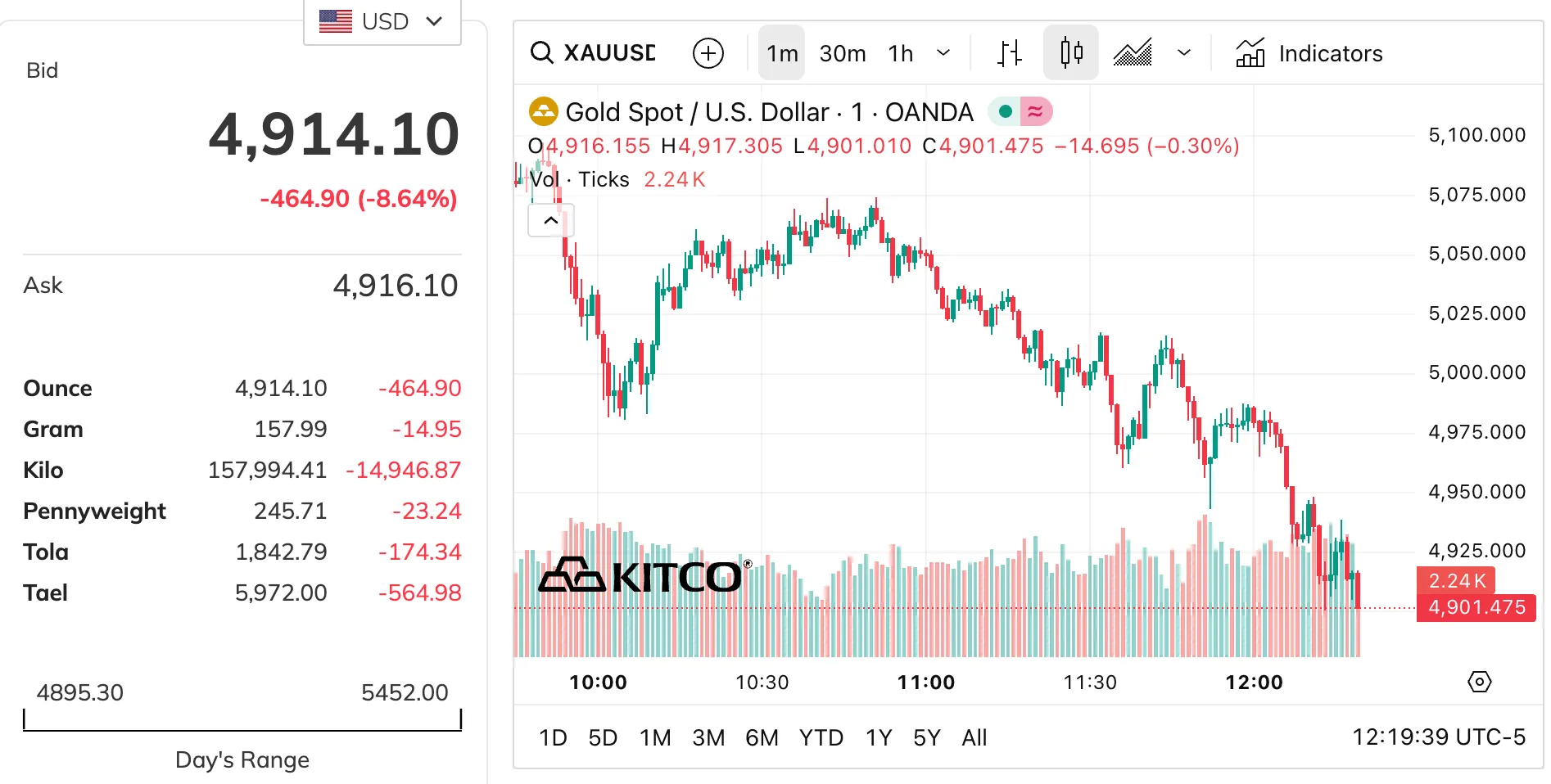 Соат 22:16 ҳолатига кўра (Тошкент вақти), олтин бир унцияси 4 914 доллардан савдо қилинмоқда. Кун давомида нархлар энг паст нуқтада 4 895 долларгача тушган. Эслатиб ўтамиз, 29 январь куни олтин нархи 5 500 доллардан ҳам ошган эди.