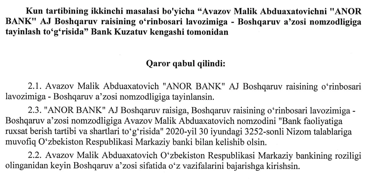 Мажлис қарорига кўра, Авазов Малик Абдуахатович “Анорбанк” Бошқарув раисининг ўринбосари лавозимига тайинланди. У мазкур лавозимга тайинланиши билан бирга банк бошқаруви аъзоси ҳам ҳисобланади.