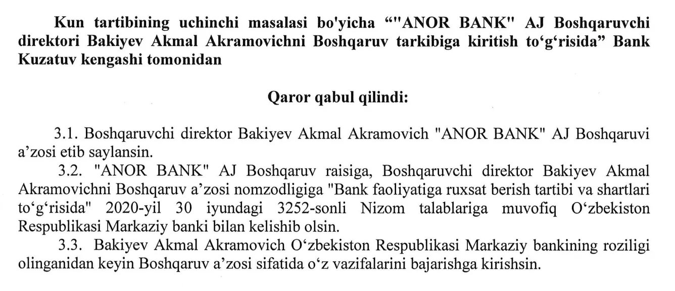 Шунингдек, банкнинг амалдаги Бошқарувчи директори Бакиев Акмал Акрамович ҳам “Анорбанк” бошқаруви аъзоси этиб тайинланди.