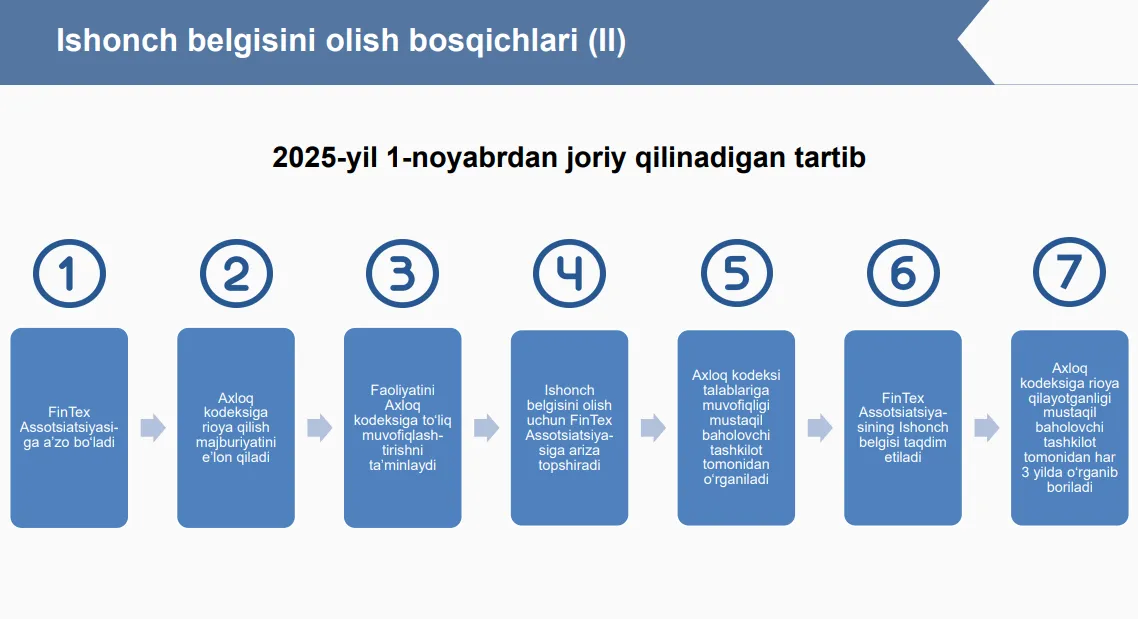 Лойиҳада “ишонч белгиси” эгалари рўйхатини FinTex ассоциацияси ўзининг расмий сайтида юритиши белгиланган.