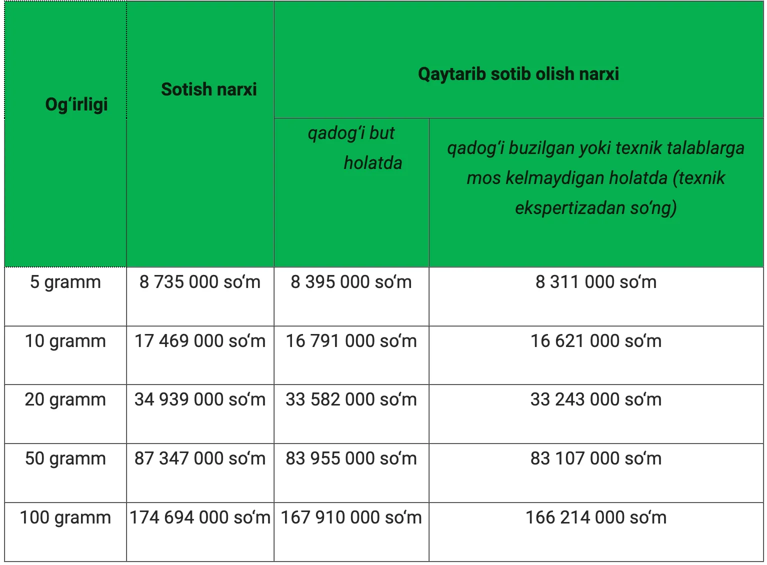 Маълумотларга кўра, олтин қуймаларининг сотиш ва қайта сотиб олиш нархлари ўртасидаги тафовут 3,9 фоиздан 4,9 фоизгача етмоқда. Қадоғи бут ва техник талабларга тўлиқ жавоб берадиган қуймалар сотиш нархидан 3,9 фоиз арзонроқ нархда қайта сотиб олинмоқда. Техник талабларга мос келмайдиган қуймалар эса сотиш нархидан 4,9 фоиз паст баҳоланмоқда.