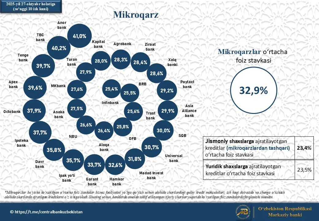 2025 йил 27 октябрь ҳолатига кўра, микроқарзларнинг ўртача фоиз ставкаси 32,9 % ни ташкил этмоқда. Бу кўрсаткич ўтган ойга нисбатан 0,9 % пунктга паст.