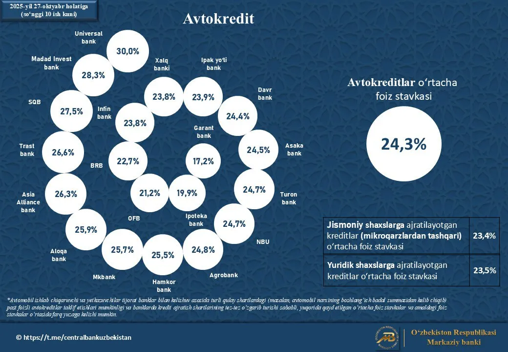 27 октябрь ҳолатига кўра, автокредитларнинг ўртача фоиз ставкаси 24,3 % бўлиб, энг юқори ставкалар Universal Bank (30 %), Madad Invest Bank (28,3 %) ва СҚБ (27,5 %)да қайд этилган. Энг паст ставкалар эса Garant Bank (17,2 %), Ipoteka Bank (19,9 %) ва OFB Bank (21,2 %) томонидан таклиф этилган.