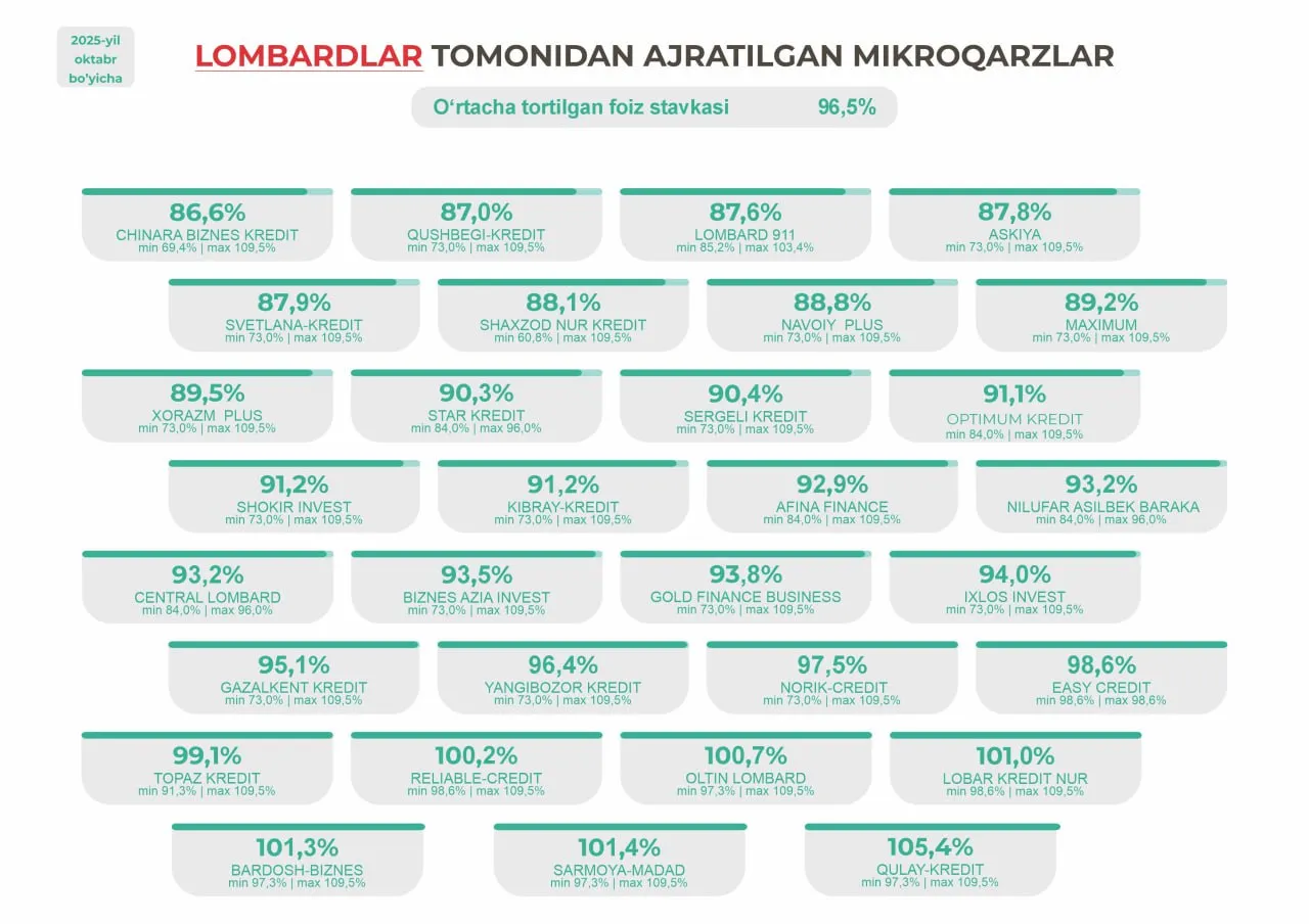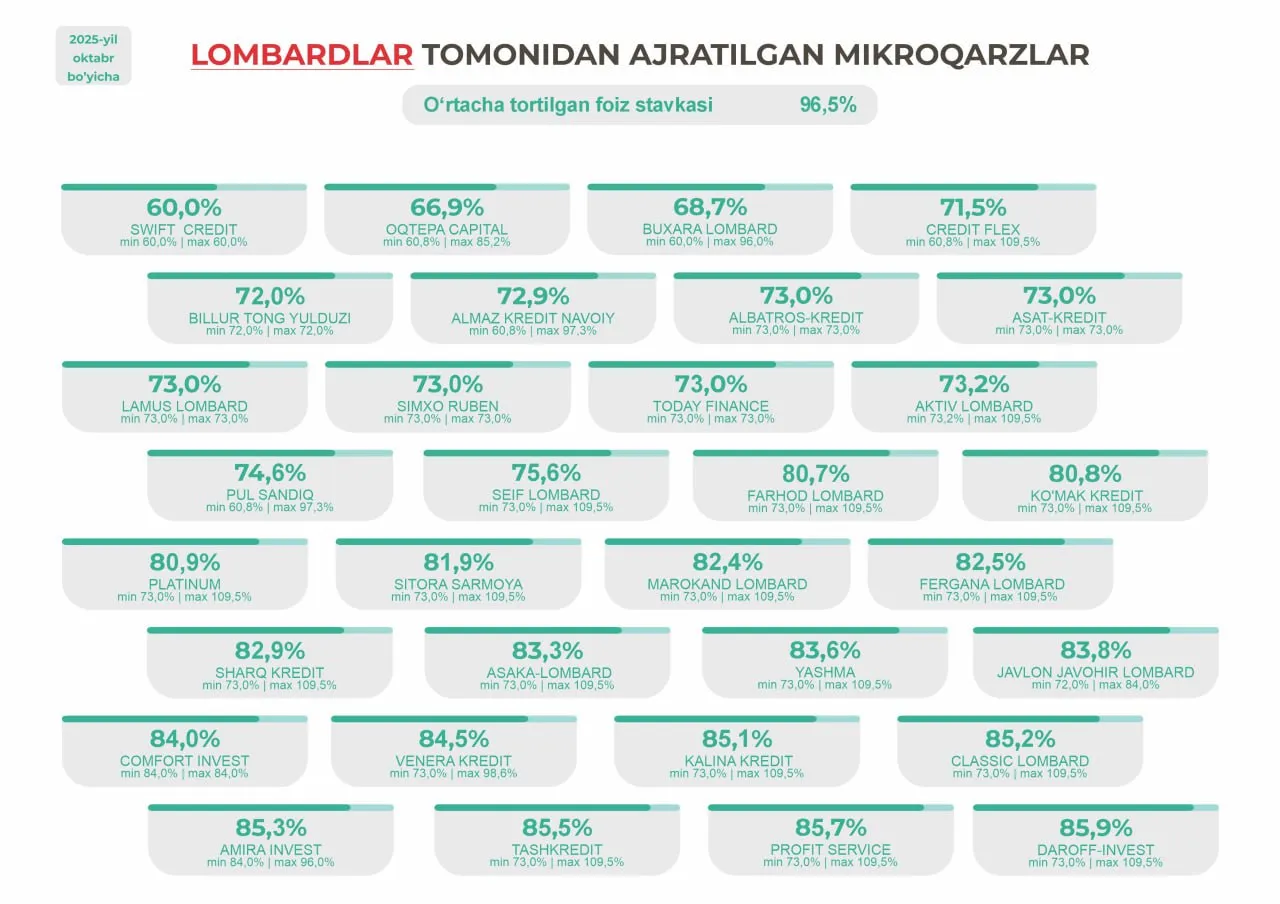2025 йилнинг октабр ойида ломбардлар томонидан ажратилган микроқарзларнинг ўртача тортилган фоиз ставкаси 96,5 фоизни ташкил қилди.