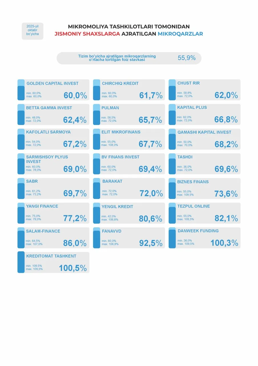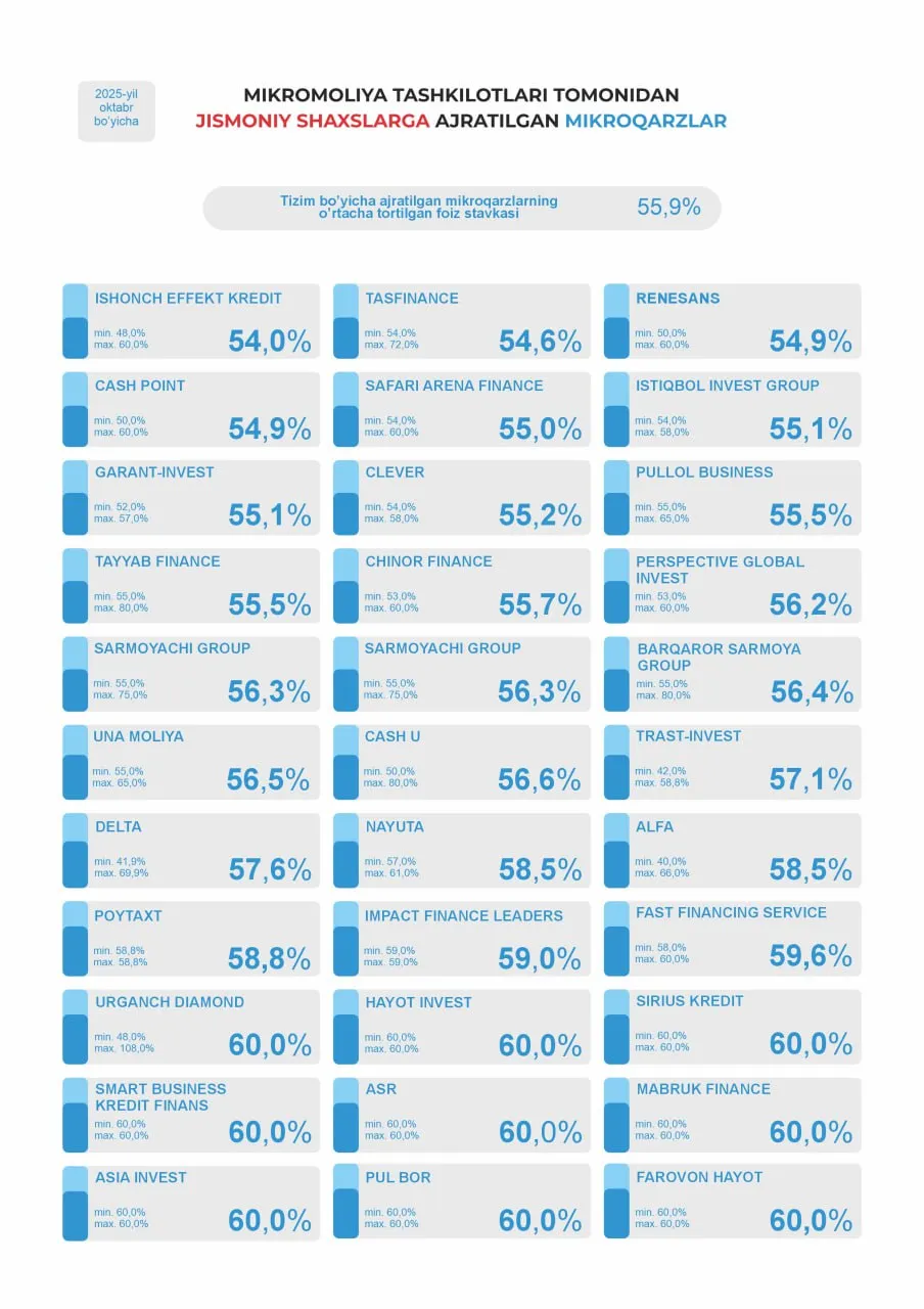 2025 йилнинг октябрь ойида микромолия ташкилотлари томонидан жисмоний шахсларга ажратилган микроқарзларнинг ўртача тортилган фоиз ставкаси 55,9 фоизни ташкил этди.