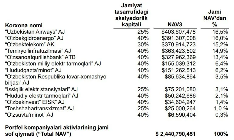 Аввалроқ Президент фармони билан жамғарманинг устав капитали ҳамда портфель таркибида муҳим ўзгаришлар амалга оширилди. Унга кўра, портфелдаги компаниялар сони 15 тадан 13 тага қисқартирилди.