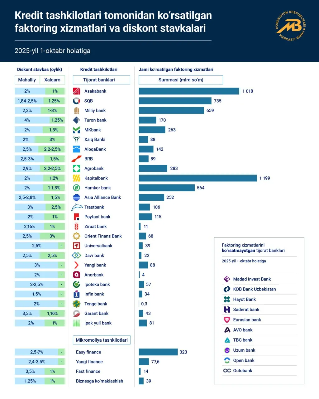 Шунингдек, хусусий банклар орасида факторинг хизматлари бўйича Капиталбанк 1,2 трлн сўм (шундан 31 млрд сўм электрон платформа орқали), Hamkorbank 564 млрд сўм (246 млрд сўм рақамли шаклда) ва Asia Alliance Bank 252 млрд сўм (143 млрд сўм электрон кўринишда) билан етакчилик қилган.