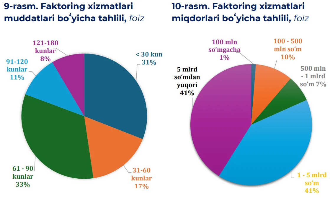 Факторинг муддати бўйича хизматларнинг 31 фоизи 30 кунгача бўлган қисқа муддатли операциялардан иборат. 61–90 кунлик хизматлар 2,2 трлн сўм билан энг катта улушни (33%) ташкил этади. Қолган қисми 31–60 кун (1,1 трлн сўм), 91–120 кун (0,7 трлн сўм) ва 121–180 кун (0,6 трлн сўм) оралиқларида тақсимланган.