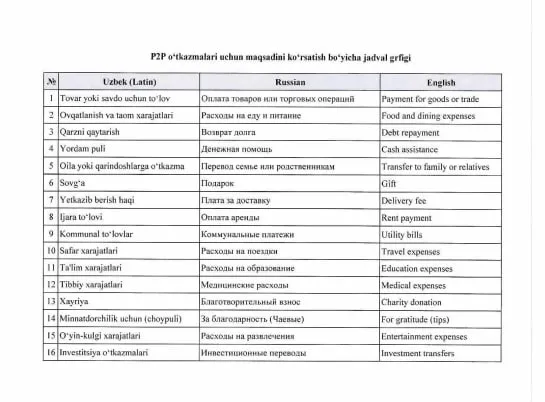 Юборилган кўрсатмага кўра, ўтказма мақсадлари 16 та турга бўлинган. Улар орасида товар ёки хизмат учун тўлов, овқатланиш харажатлари, ижара тўлови, таълим харажатлари каби тоифалар мавжуд.