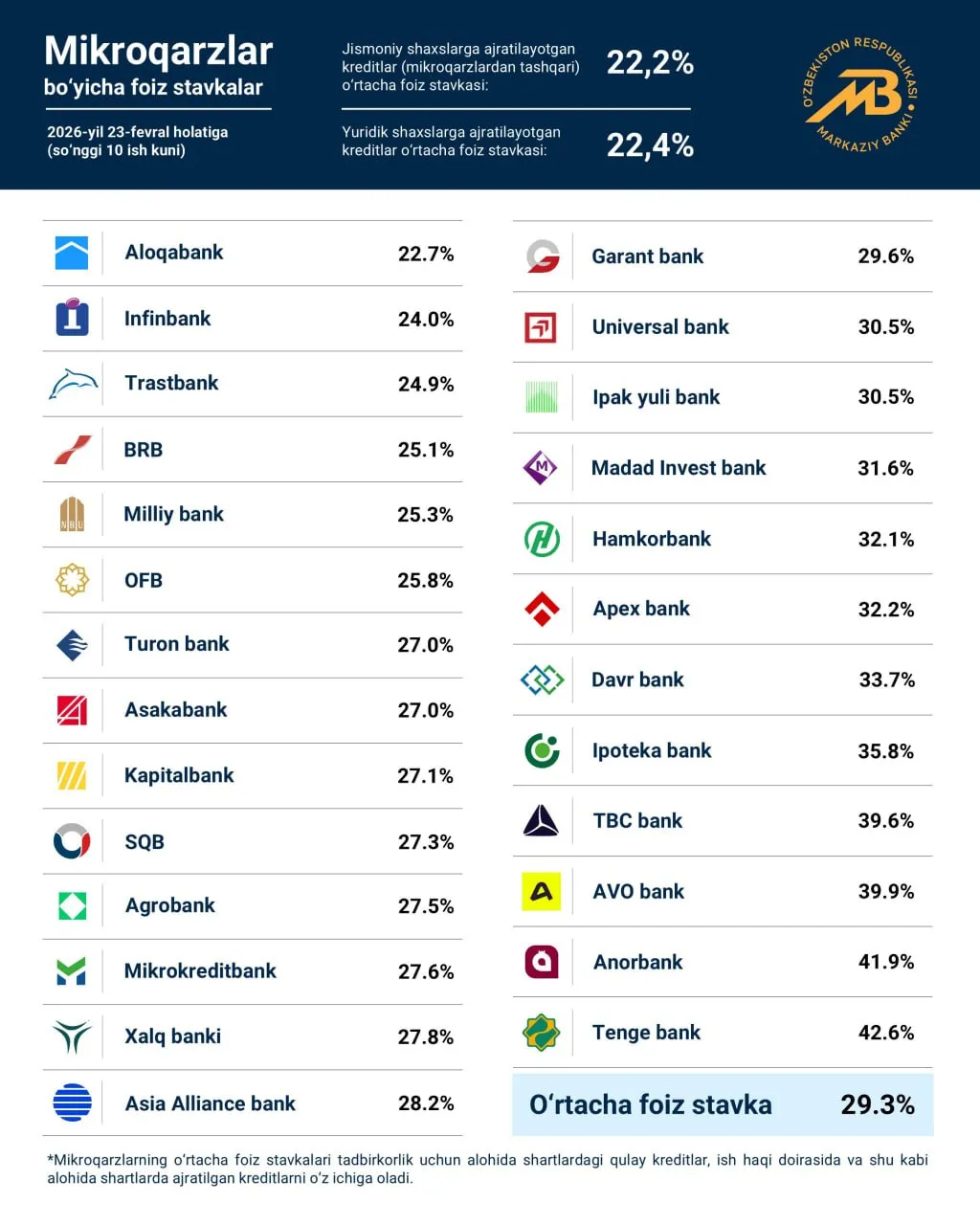 Микроқарзлар бўйича ўртача ставка 23 февраль ҳолатига кўра, 29,3 фоизгача пасайди. Бу статистика эълон қилина бошлангандан кейинги давр учун энг паст кўрсаткичдир.  2025 йил июль ойи бошидан маълумотлар эълон қилина бошланган. Ҳозирга келиб бу кўрсаткич 6,1 фоизга пасайди.