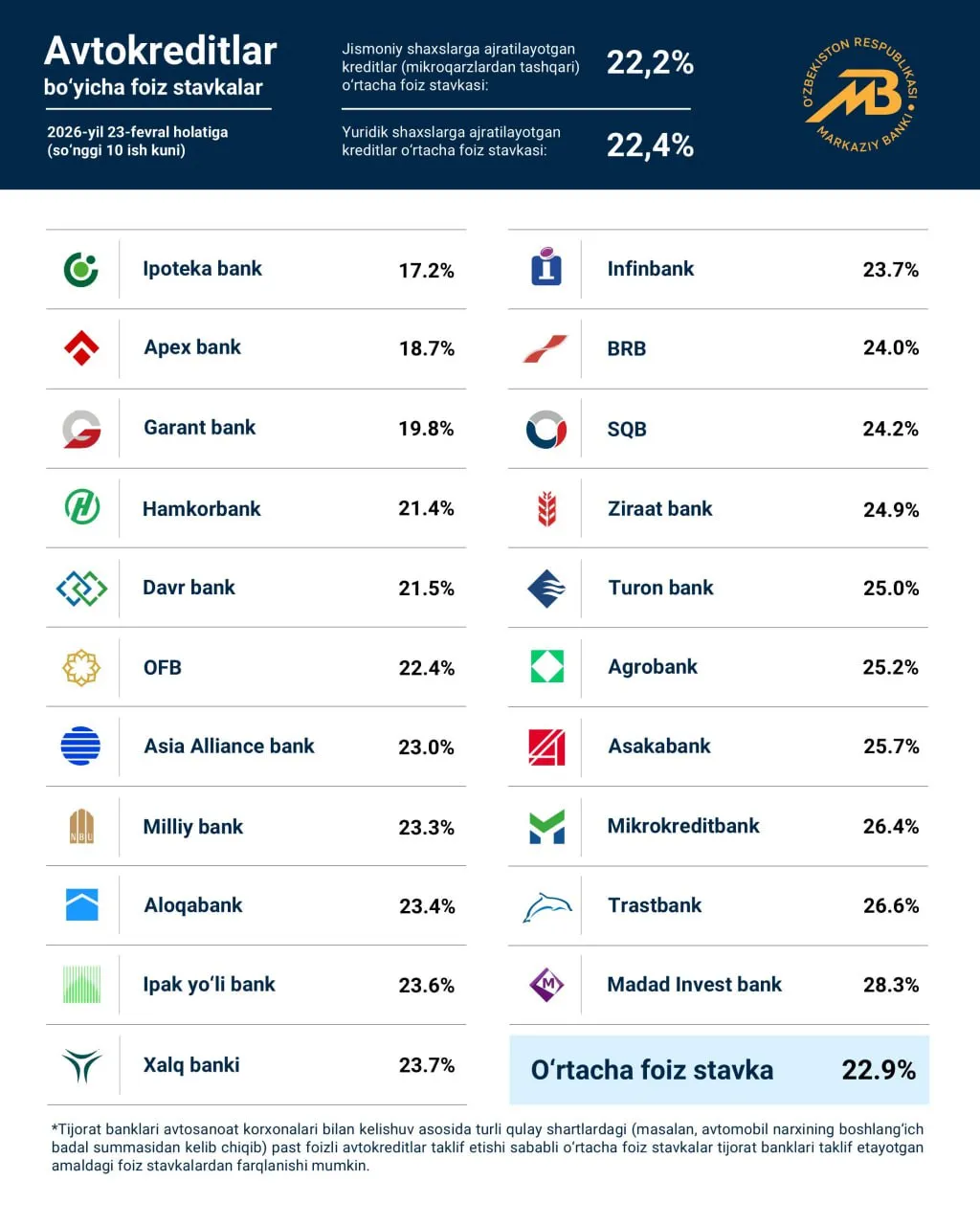 Умумий кўрсаткичларга назар ташласак, жисмоний шахсларга ажратилаётган кредитлар (микроқарзлар бундан мустасно) ўртача 22,2% ни, юридик шахслар учун эса 22,4% ни ташкил этмоқда.