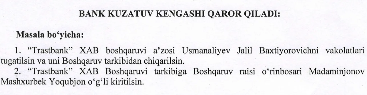 Кенгаш қарорига мувофиқ, Мадаминжонов Машхурбек Ёқубжон ўғли “Трастбанк” Бошқаруви раиси ўринбосари этиб тайинланган, ҳамда шу муносабат билан банк Бошқаруви таркибига киритилган. Унинг номзоди Марказий банк ҳузуридаги тегишли комиссия томонидан кўриб чиқилиб, ижобий хулоса берилган. Кузатув кенгаши аъзолари мазкур қарорни бир овоздан маъқуллади.