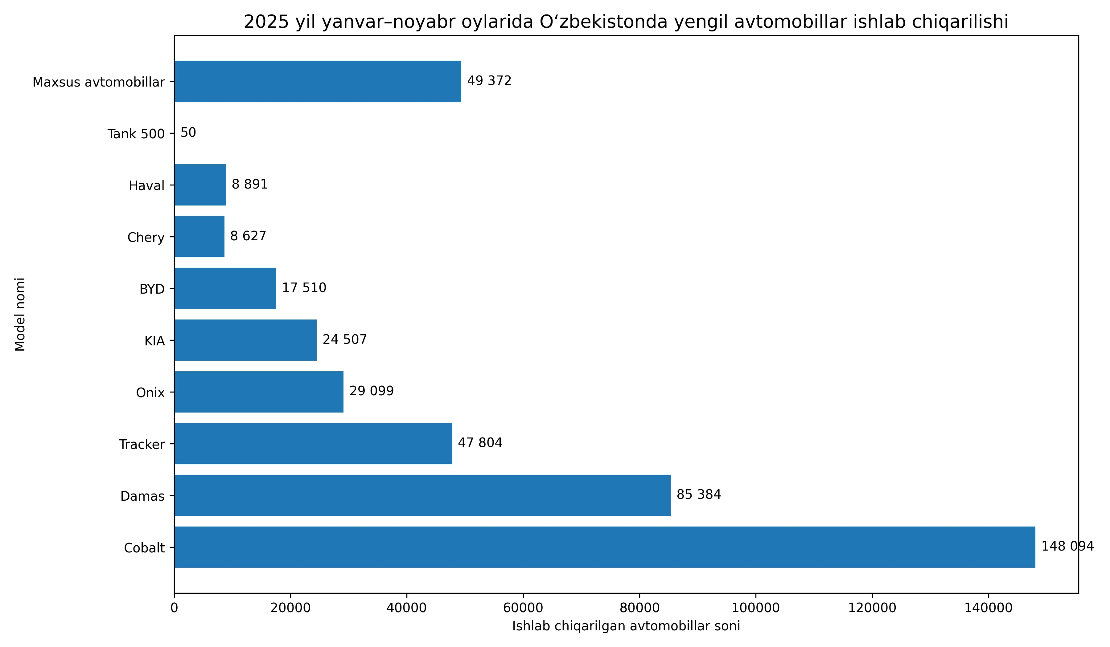 2025 йилнинг январь–ноябрь ойларида Ўзбекистонда 419 мингдан ортиқ енгил автомобиль ишлаб чиқарилди.