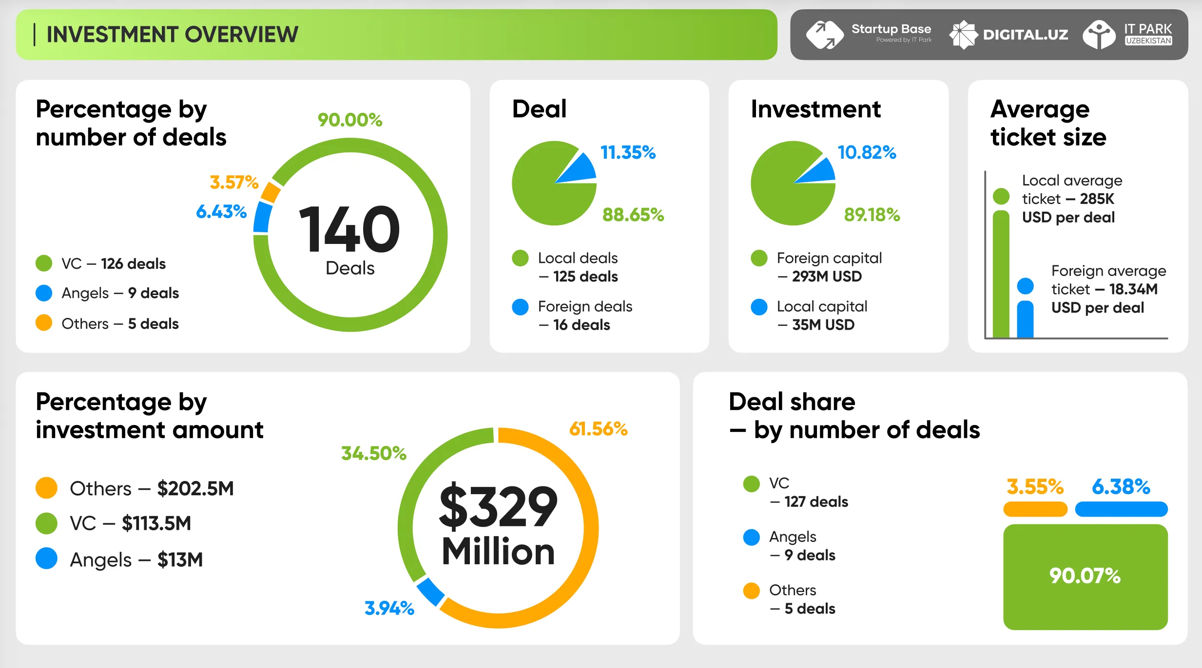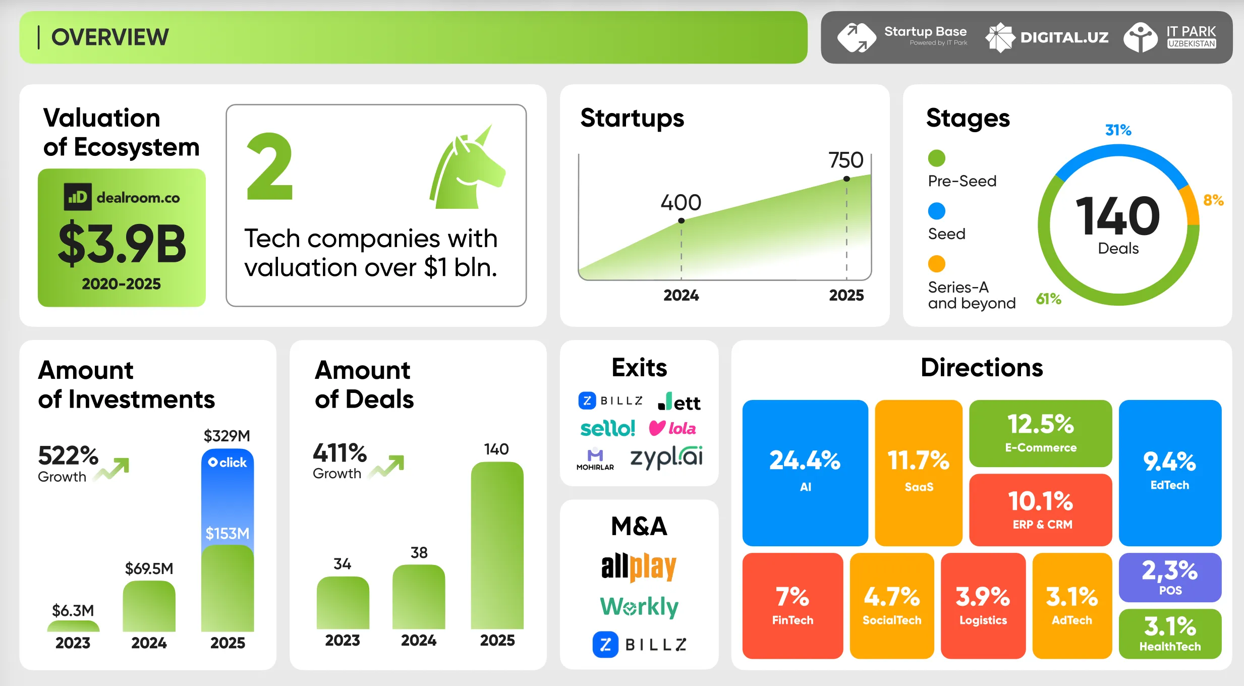 2025 йилнинг ўзида мамлакатда яна 250 та янги стартап пайдо бўлди. Йил давомида амалга оширилган инвестиция битимлари сони 140 тага етди. Бу кўрсаткич аввалги йилга нисбатан 411 фоизга кўпроқ бўлиб, Ўзбекистон стартап бозорида инвесторлар фаоллиги сезиларли даражада ошганини кўрсатади.
