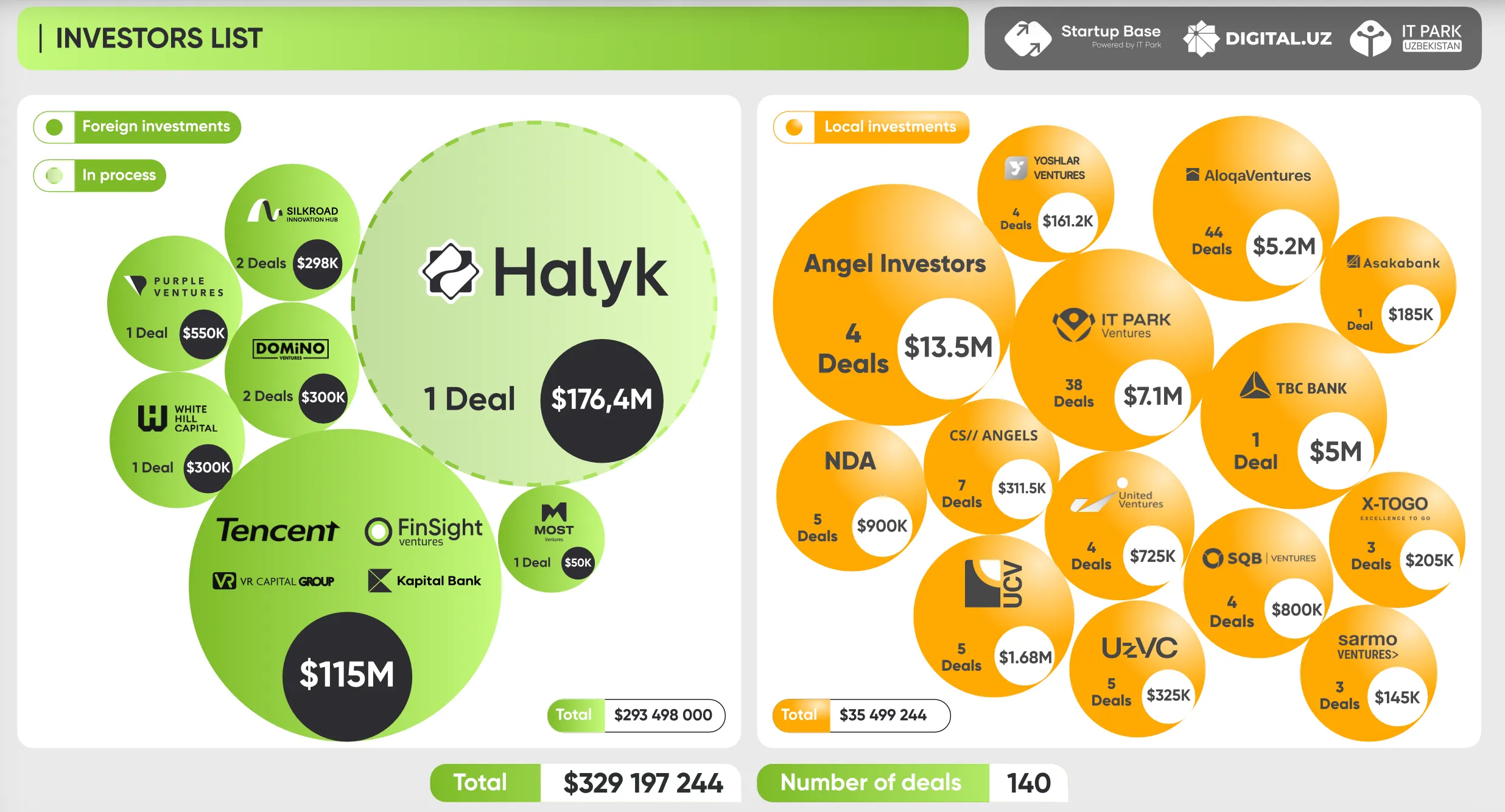 Ички бозорда энг фаол инвесторлар қаторига $13,5 млн билан ангел инвесторлар, $7,1 млн билан IT Park Ventures, $5,2 млн билан AloqaVentures ҳамда $5 млн билан TBC Bank киради.