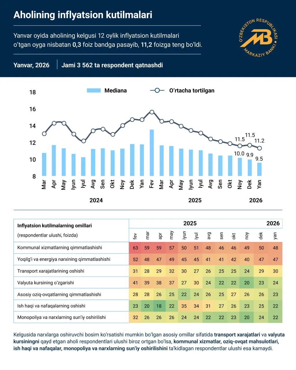 Январ ойида инфляцион инфляцион кутилмалари пасайиб, келгуси 12 ой учун ўртача прогноз 11,2%ни ташкил этди. Энг юқори кутилмалар Тошкентда қайд этилган бўлса, асосий омил сифатида коммунал тарифлар ошиши кўп тилга олинган.