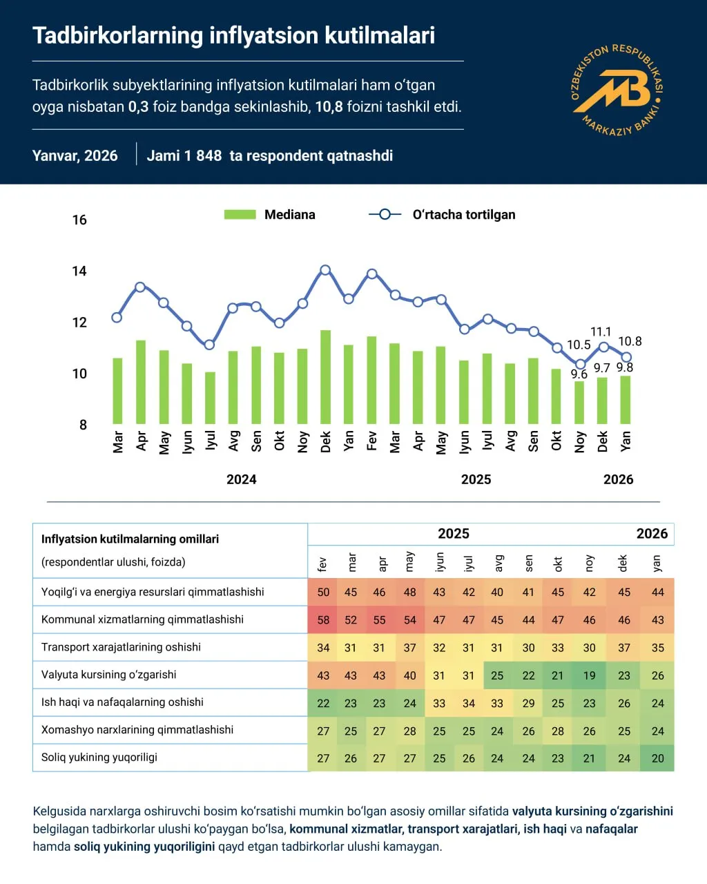 Тадбиркорлар орасида кутилаётган инфлятсия даражаси 10,8%ни ташкил этди ва декабрга нисбатан 0,3 фоиз пунктга камайди. Бироқ медиан кўрсаткич бироз ошиб, 9,8%га етди.