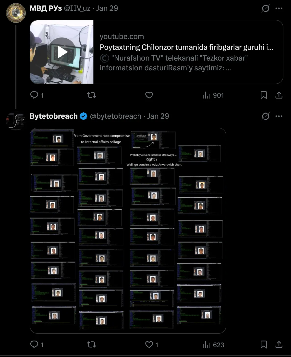 Этот хакер известен под псевдонимом ByteToBreach и действует с июня 2025 года. За шесть дней до появления сообщений об утечке данных граждан Узбекистана на форумах Reddit он оставил комментарий на странице Министерства внутренних дел в сети X (бывший Twitter) со словами: «Hello ??? Are you guys… Alive?».