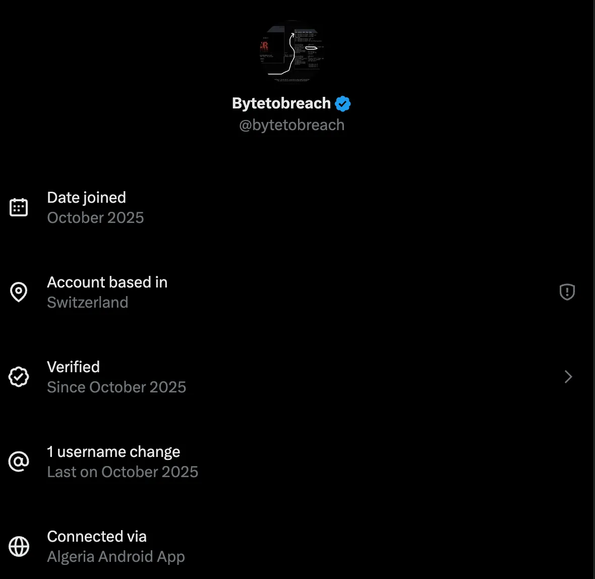 В профиле хакера в сети X в качестве местоположения указана Швейцария, однако достоверность этой информации не подтверждена. Отмечается, что подключение пользователя осуществлялось через Android-устройство из Алжира.