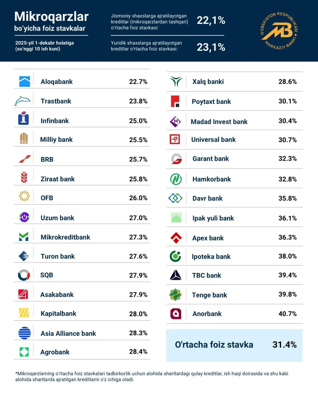 По состоянию на 1 декабря средние процентные ставки по микрозаймам и автокредитам в банках достигли самого низкого уровня с начала публикации статистических данных.