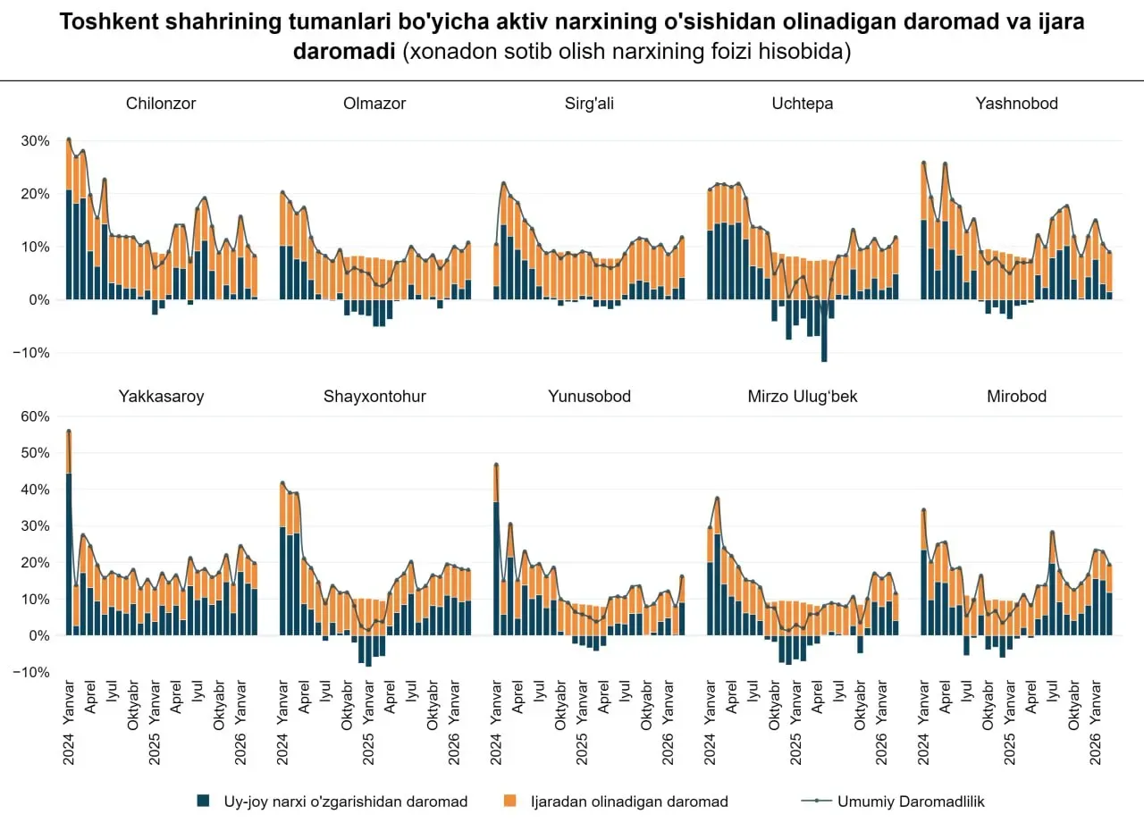 Средняя прибыль от покупки и перепродажи жилья за год составила 6,6%. Наибольший рост стоимости активов зафиксирован в Мирабадском (16,6%) и Яккасарайском (12,4%) районах, где расположено дорогое жилье.