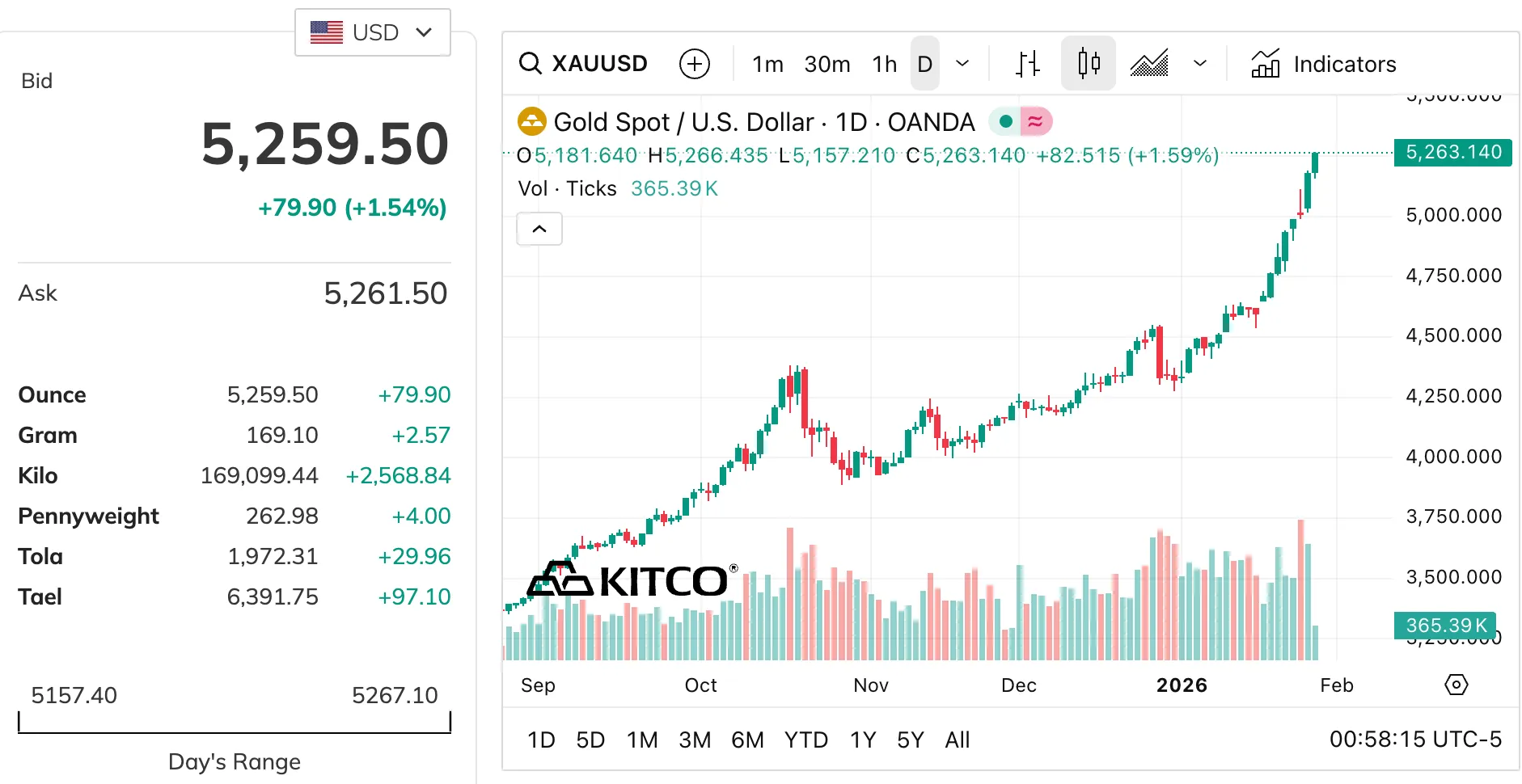 На момент подготовки сообщения одна унция драгоценного металла торгуется в районе 5 259 долларов.