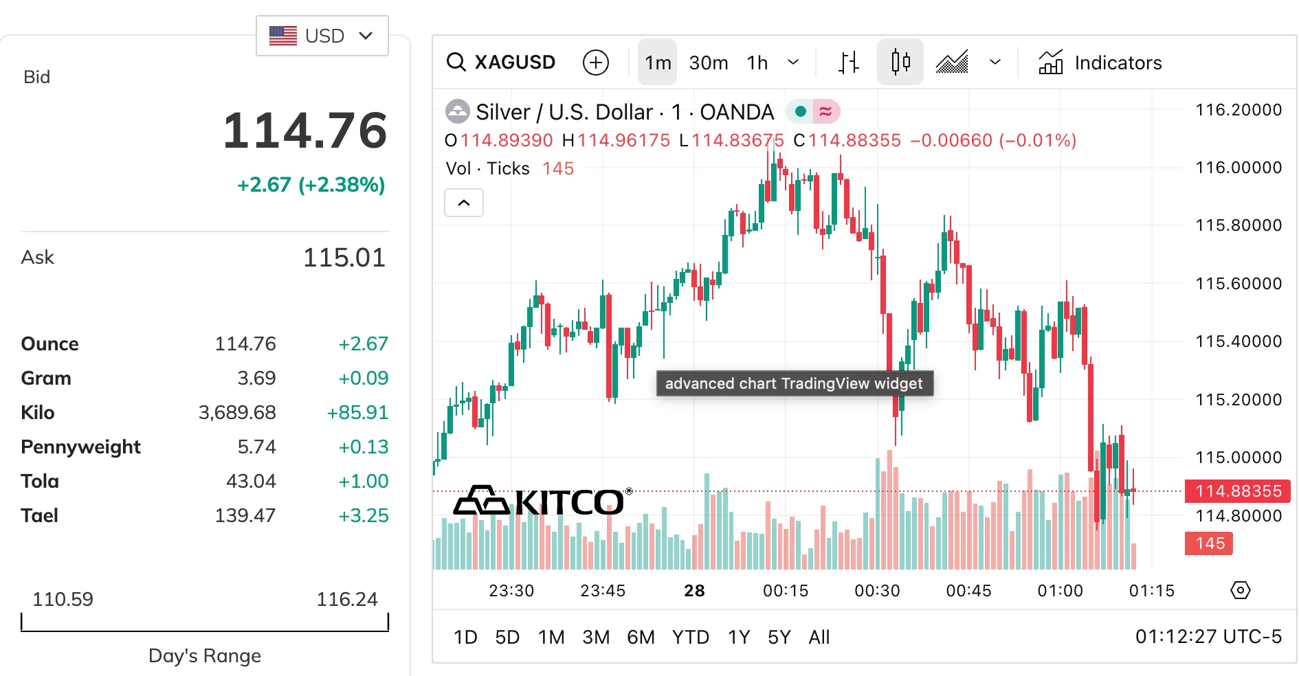 В то же время цена на серебро также достигла исторического максимума. По состоянию на 28 января 2026 года серебро торгуется на уровне около 115 долларов за унцию. В течение дня цена достигала даже 117,75 доллара, уверенно преодолев 100-долларовый рубеж.