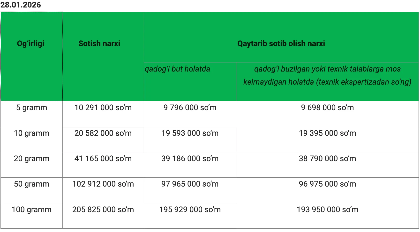 В Узбекистане цены на золотые слитки обновляют рекорды седьмой день подряд. 28 января стоимость 5-граммового золотого слитка достигла почти 10,3 млн сумов. В то же время котировки золота на мировых рынках впервые в истории превысили 5 200 долларов, зафиксировав новый ценовой максимум на драгоценный металл.