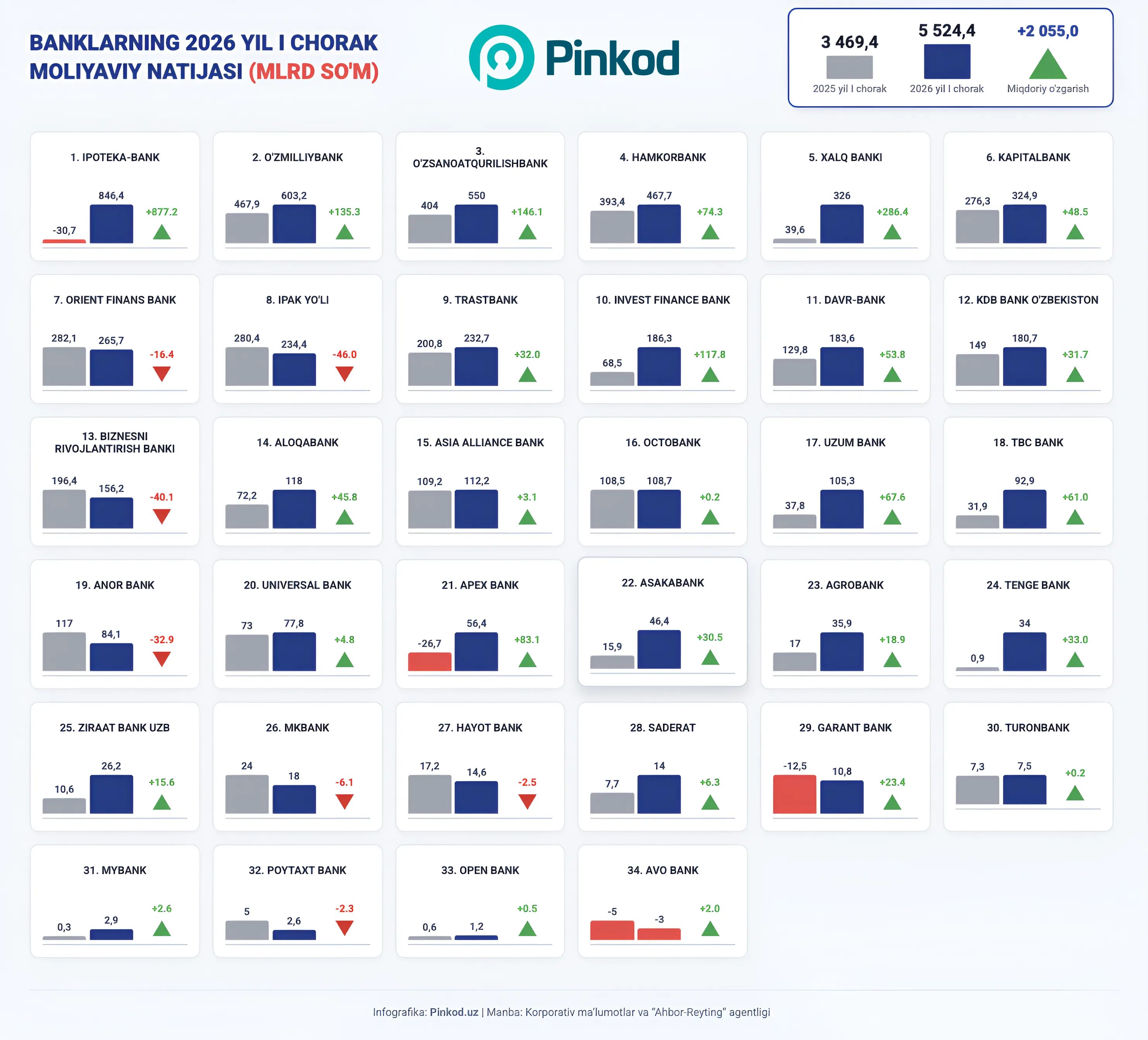 Из 34 действующих в Узбекистане банков 33 завершили квартал с прибылью. Только AVO банк зафиксировал чистый убыток в размере 3 млрд сумов в первом квартале. Несмотря на это, убыток банка сократился на 2 млрд сумов. Также относительно небольшую чистую прибыль зафиксировали Open Bank (1,2 млрд сумов), Пойтахт банк (2,6 млрд сумов) и My Bank (2,9 млрд сумов).