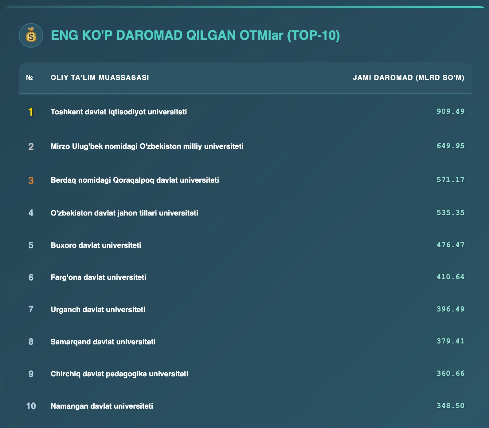 С точки зрения финансовой эффективности, самая большая чистая прибыль была зафиксирована в Каракалпакском государственном университете имени Бердаха — 77,7 млрд сумов. За ним следуют Каршинский государственный технический университет (57,8 млрд сумов) и Андижанский государственный технический институт (33,8 млрд сумов).