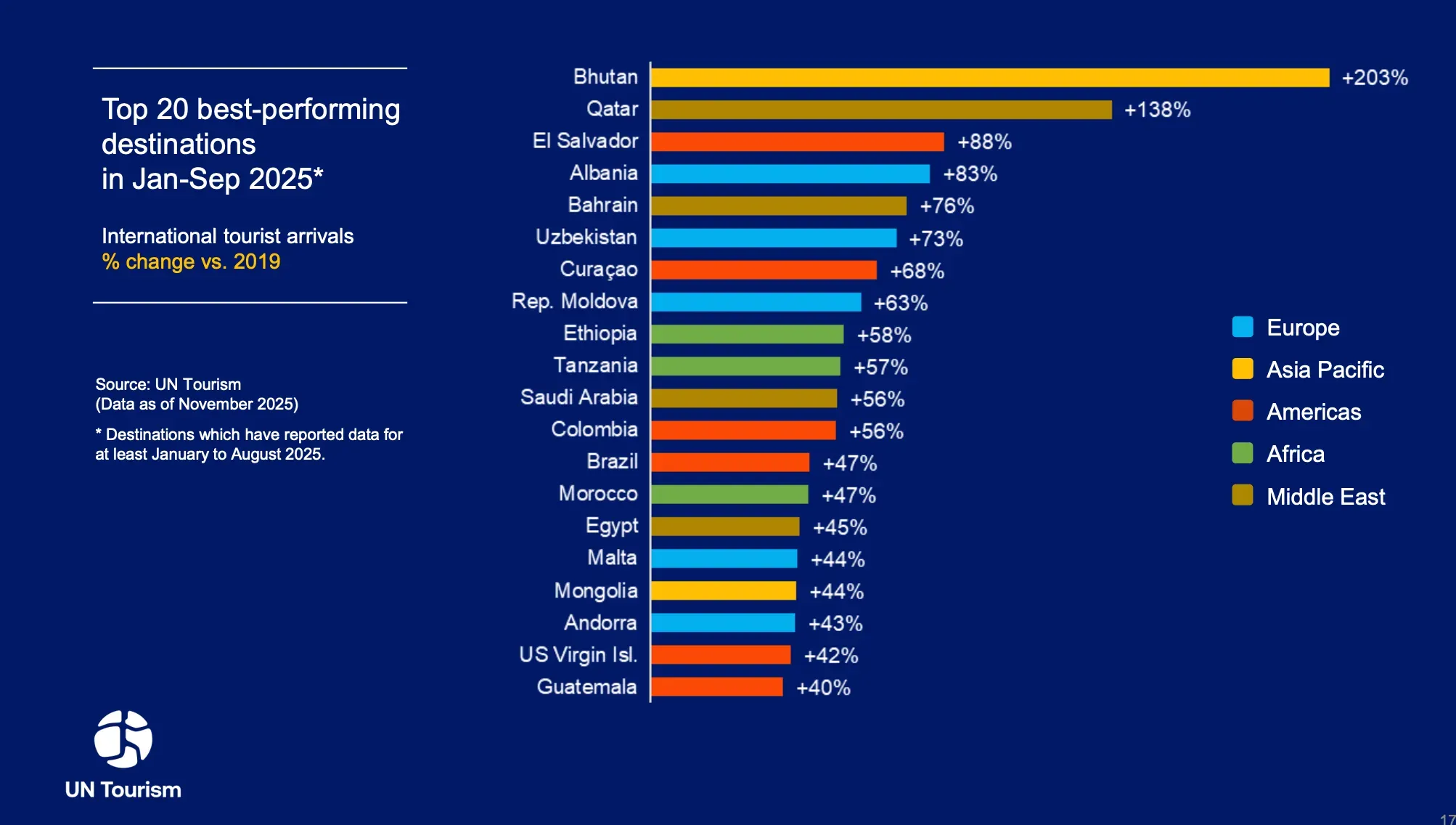 По данным Всемирной туристской организации, Узбекистан вошел в топ-20 стран мира с самым высоким ростом по привлечению иностранных туристов в январе–сентябре 2025 года.