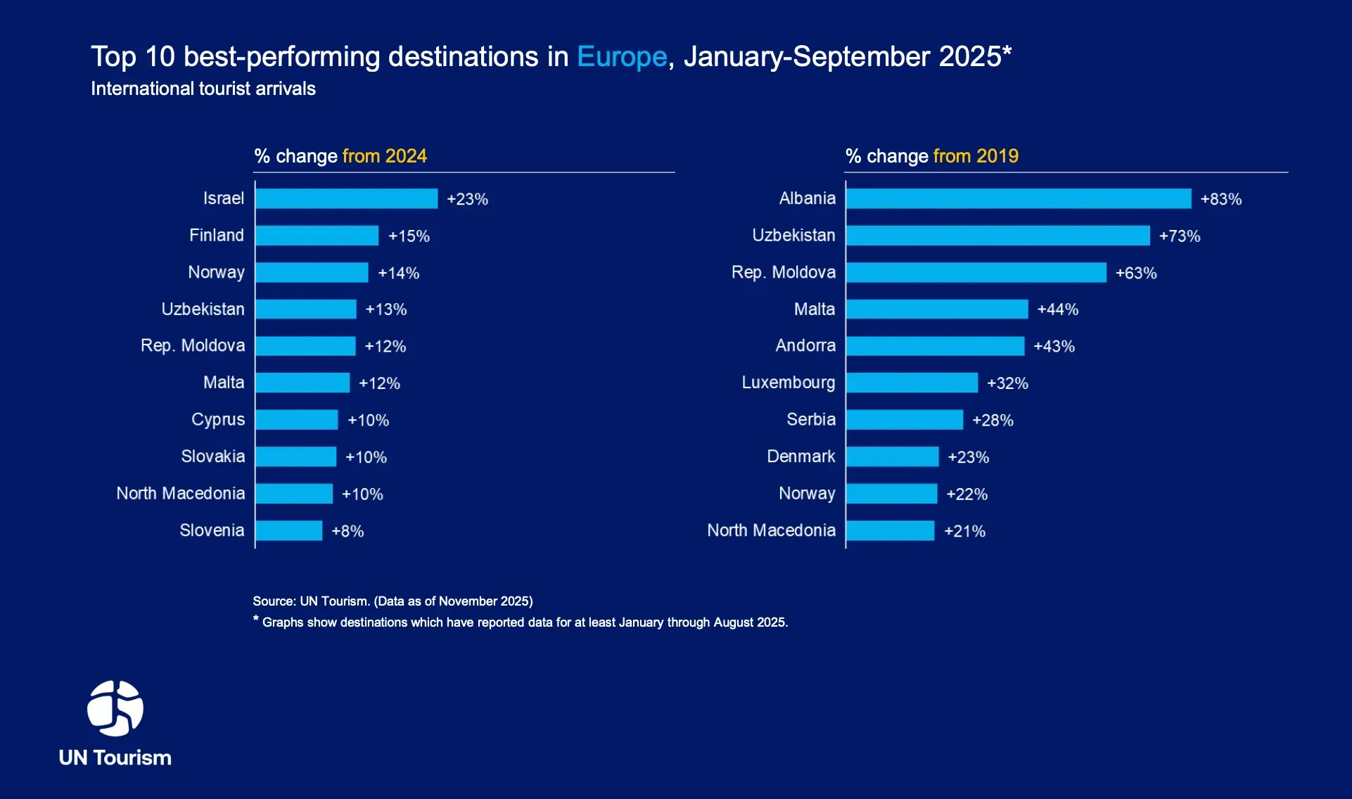 Кроме того, Узбекистан стал одним из 10 туристических направлений с самым быстрым ростом в Европе за девять месяцев текущего года. В январе–сентябре число международных туристов, прибывших в страну, увеличилось на 13 процентов по сравнению с 2024 годом. Этот показатель является четвертым по величине в Европейском регионе после Израиля (+23%), Финляндии (+15%) и Норвегии (+14%).