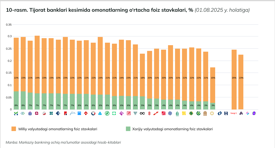 В целом, в Узбекистане наибольшие средства населения хранятся в Капиталбанк и Национальный банк. Однако по средней стоимости вклада лидирующие позиции занимают Асакабанк (43,3 млн сумов) и Агробанк (36,5 млн сумов).