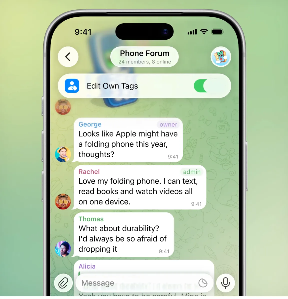 Теперь участники групповых чатов могут добавить тег рядом со своим именем. Это может быть должность или роль в команде, специальность в университете и прочее. Например, в чате с соседями можно указать номер квартиры или машины, а в онлайн-сообществе — заявить о своих интересах.