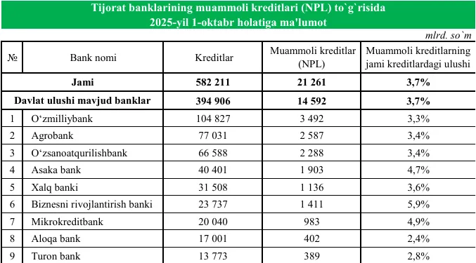 2025 yilning 9 oyi yakunlariga koʻra, Oʻzbekiston bank tizimining jami kredit portfeli 582,2 trillion soʻmni tashkil etdi. Bu yil boshiga nisbatan 49,1 trillion soʻmga koʻpdir. Shu bilan birga, muammoli kreditlarning umumiy kreditlardagi ulushi 4 foizdan 3,7 foizgacha kamaydi.