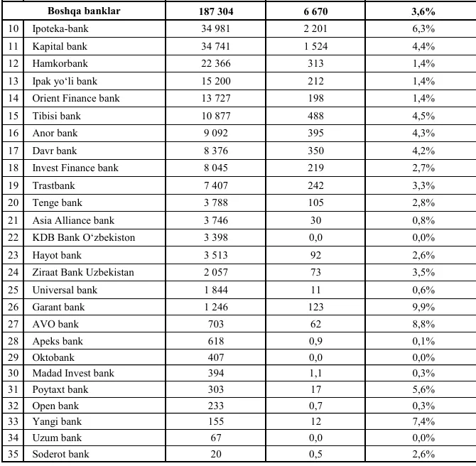 Shu bilan birga, TBC Bank (+3,4 trln soʻm), Kapitalbank va Hamkorbank (+3,1 trln soʻmdan), Hayot Bank (+2,3 trln soʻm) hamda Anorbank (+2,2 trln soʻm) faol oʻsish qayd etgan xususiy banklar boʻldi.