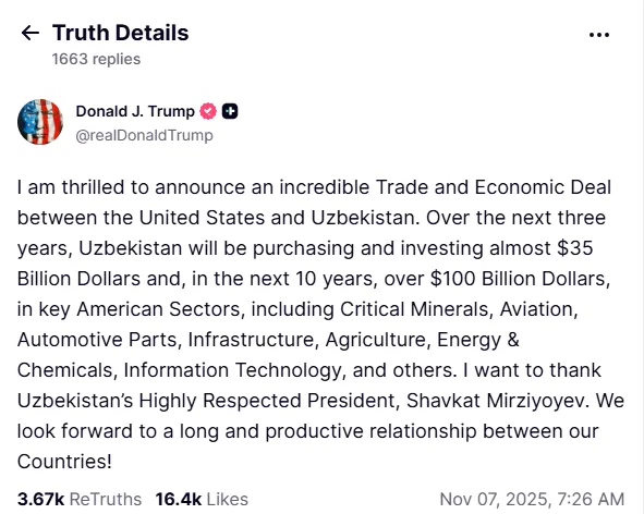 Donald Tramp oʻzining Truth Social tarmogʻidagi sahifasida Oʻzbekiston bilan “misli koʻrilmagan savdo-iqtisodiy kelishuv” imzolanganini maʼlum qildi.