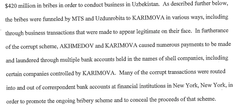 Keyinchalik AQSh Adliya vazirligi xulosalari MTS va uning shoʻʼba korxonalari 2004 yildan 2012 yilgacha Oʻzbekiston bozoriga kirish, faoliyat yuritish va kengayish uchun Karimovaga taxminan 420 mln dollar pora toʻlaganini tasdiqladi (hujjat matni Pinkod ixtiyorida mavjud).