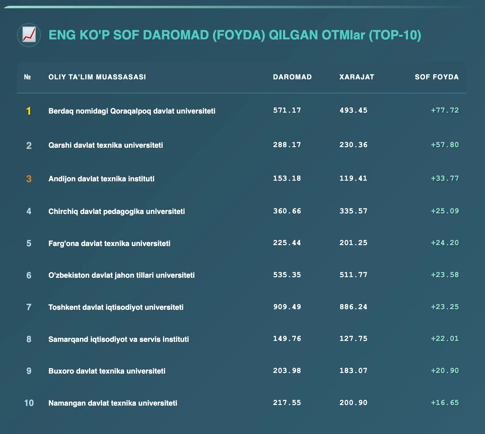 Sof foyda boʻyicha esa Berdaq nomidagi Qoraqalpoq davlat universiteti 77,7 mlrd soʻm natija bilan yetakchilik qildi.